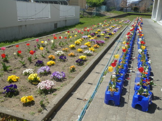 先週、先生達は花の苗を植えました。サルビアなど色とりどりのお花が玄関前にきれいに咲いています。