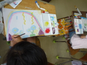 今週は、その木にそれぞれが灯をともしました。お家の方にもご協力いただいたポンポンを使って、自分の思い描く色をつくり、木の上から色づけをしていきます。色作り、色の付き具合、写った形など、みんなが試行錯誤しながら楽しくポンポンできた時間になりました。