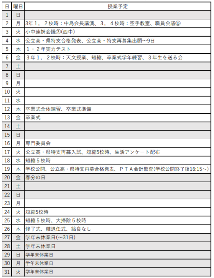 (授業日数:1・2年生18日 3年生10日)